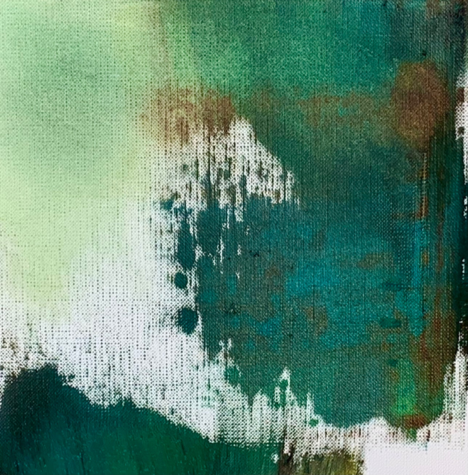 From mistakes to meaning…one of the squares made from a rectangular landscape I made yesterday. It was too much like a real landscape so it had to morph into an abstraction or into the bin. Waste not want not came to mind so after cutting off a chunk it was easier to add my own personality. I like it now. It has a sense of mystery asking the viewer to decide, land or sea or forest or moor? The choice is yours.